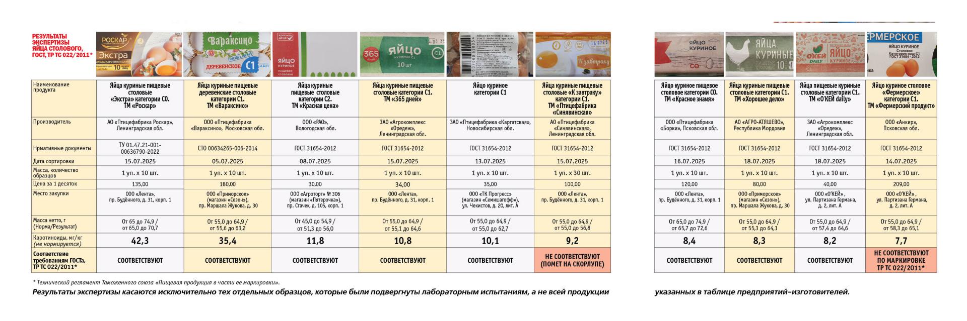 Одним из основных показателей качества яиц является количество в желтке каротиноидов (пигмент, характеризующий цвет желтка, обеспечивает синтез витамина А в организме человека). Несмотря на то что их содержание ГОСТ 31654-2012 не регламентирует, «Общественный контроль» ежегодно оценивает этот показатель, чтобы понять, какие марки куриного яйца являются наиболее полезными для потребителя.