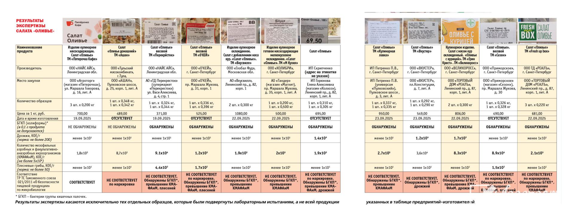 Так, в салате оливье заводского производства ТМ «Грин Крест», ТМ «Великоросс» (ООО «Великоросс», г. Санкт-Петербург) по цене 806 руб./кг со сроком годности 10 суток, упакованном в промышленную упаковку под вакуумом и приобретенном в торговой сети «Реалъ», были обнаружены БГКП, а также превышение допустимого количества мезофильных аэробных и факультативно-анаэробных микроорганизмов (МАФАнМ) в 1,66 раза и дрожжей в 3,4 раза.