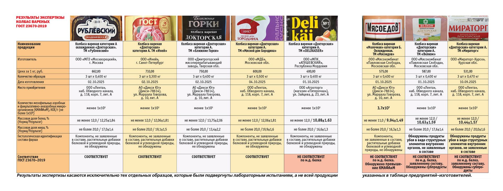 Согласно протоколам испытаний, обязательным требованиям ГОСТ 23670-2019 по проверенным показателям соответствовала колбаса «Докторская» только четырех торговых марок: ТМ «Иней» (ООО «Иней», г. Санкт-Петербург) по цене 733 руб./кг, ТМ «Ближние Горки» (ООО «Дмитрогорский мясоперерабатывающий завод», Тверская обл.) по цене 750 руб./кг, ТМ «Рублевский» (ООО «МПЗ «Москворецкий», г. Москва) по цене 662 руб./кг и ТМ «Мясной дом Бородина» (ООО «МДБ», Московская обл.) по цене 600 руб./кг.