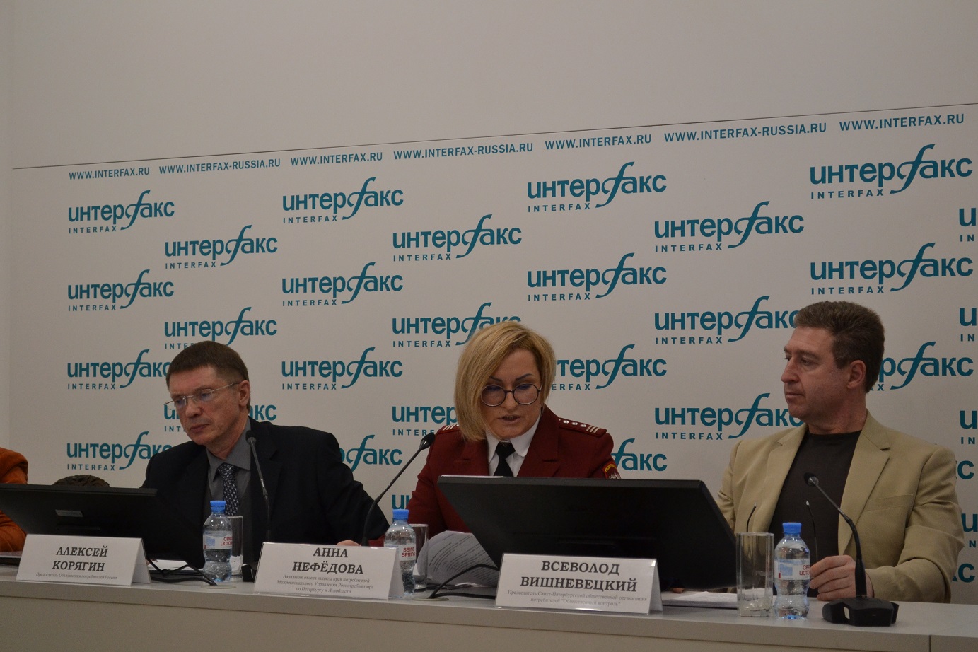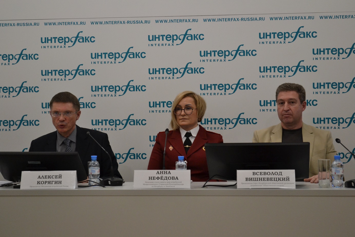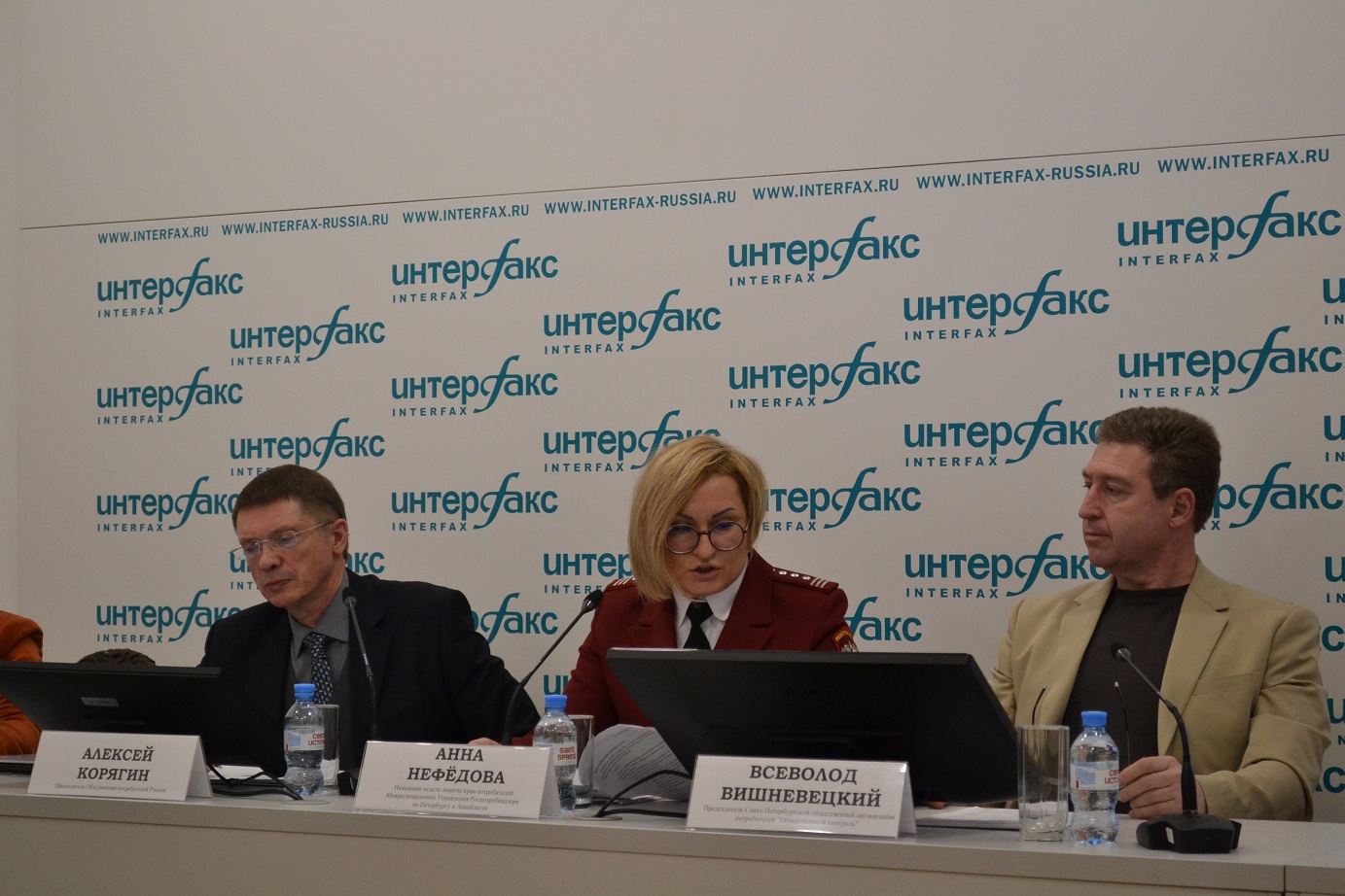 В пресс-конференции приняли участие начальник отдела защиты прав потребителей Межрегионального управления Роспотребнадзора по Санкт-Петербургу и Ленобласти Анна Нефедова, председатель Объединения потребителей России Алексей Корягин, председатель Санкт-Петербургской общественной организации потребителей "Общественный контроль" Всеволод Вишневецкий.