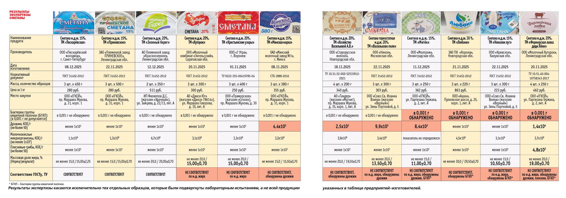 Так, в сметане 15% ТМ «Минская марка» (ОАО «Минский молочный завод № 1», Республика Беларусь, г. Минск), приобретенной в «О’КЕЕ» по цене 355 руб./кг, количество дрожжей превысило допустимую норму в 8,8 раза, а в сметане 20% ТМ «Хозяйство Васильевой А.В.» (ООО «Старорусское молоко», Новгородская обл.), приобретенной в магазине «Магнит» по цене 340 руб./кг, – в 5 раз.