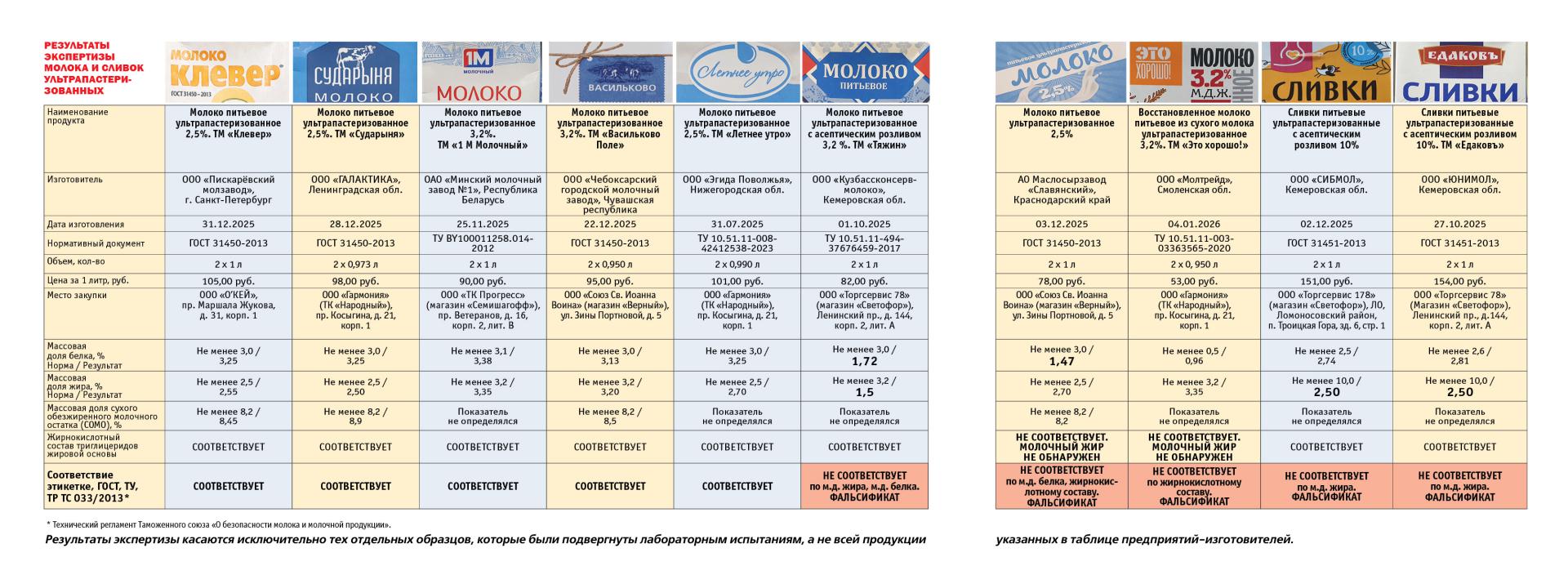 Согласно протоколам испытаний, требованиям нормативных документов полностью соответствовали только пять образцов ультрапастеризованного молока из десяти проверенных: ТМ «Клевер» (ООО «Пискарёвский молзавод», г. Санкт-Петербург), ТМ «Летнее утро» (ООО «Эгида Поволжья», Нижегородская область), ТМ «Сударыня» (ООО «ГАЛАКТИКА», Ленинградская обл.), ТМ «1 М Молочный» (ОАО «Минский молочный завод № 1», Республика Беларусь) и ТМ «Васильково Поле» (ООО «Чебоксарский городской молочный завод», Чувашская Республика).
