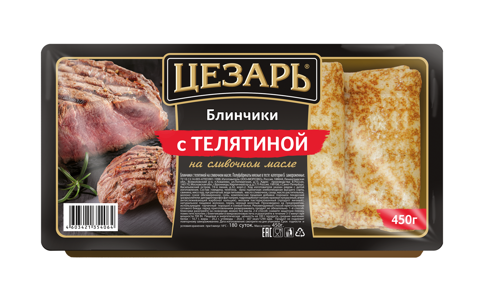 Полуфабрикаты мясные в тесте категории Б. Замороженные. Блинчики с телятиной, 450 г., ТМ «Цезарь», ТУ 10.13.14-005-47955901-1998 - Газета "Петербургское качество"